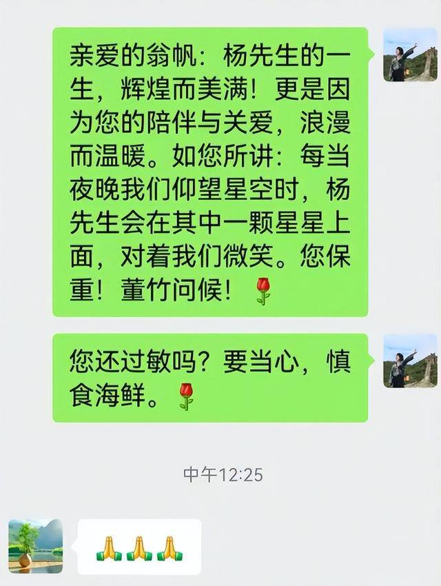 从对话内容不难看出,董竹这次私下联系,既是想向老先生表示悼念,也着实是有些担心翁帆本人的情况。
