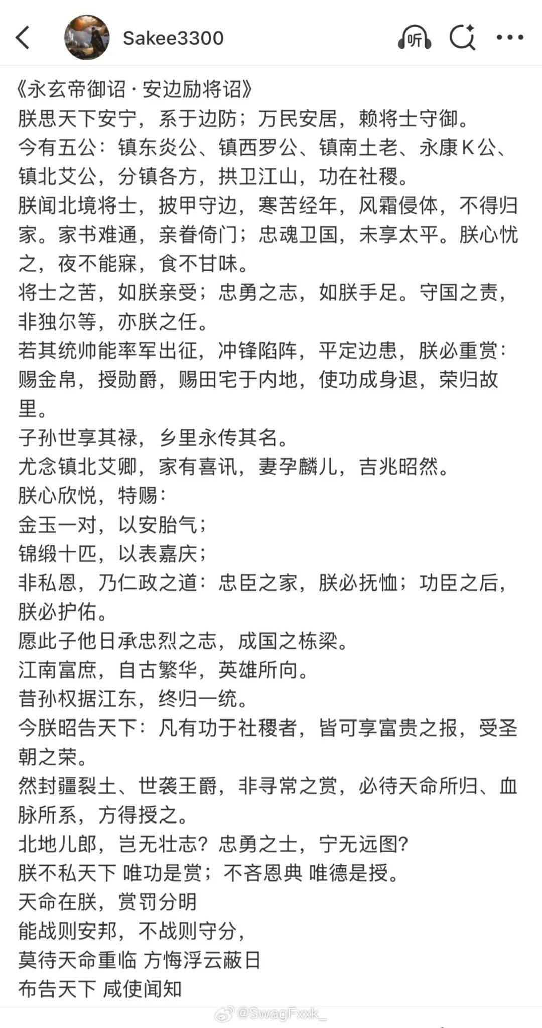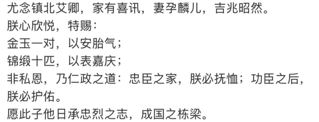 尤念镇北艾卿,家有喜讯,妻孕麟儿,吉兆昭然。