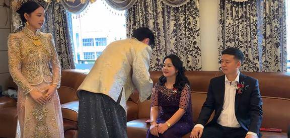 这次三妹的婚礼不一样,上次二妹章若瑶是在外面办的,这次她是在室内搞的。她还穿着喜庆的秀禾服,在娘家给父母敬茶呢。