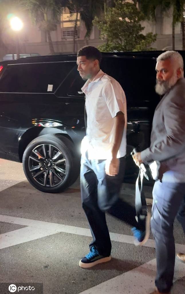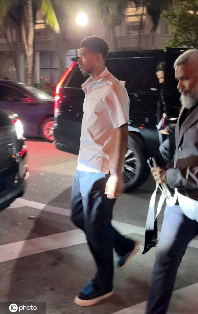 英国球星祖德·贝林厄姆身穿白色衬衫牛仔裤,现身迈阿密街头,准备享受晚餐时光。