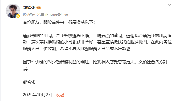 10月25日下午,歌手郑智化在微博发文,称深圳机场对残疾人的态度没人性,升降车离机门地板25公分,他的轮椅推不进飞机,腿也跨不进机舱门,操纵升降车的司机完全不愿把升降板提高,冷眼看着他连滚带爬进飞机。