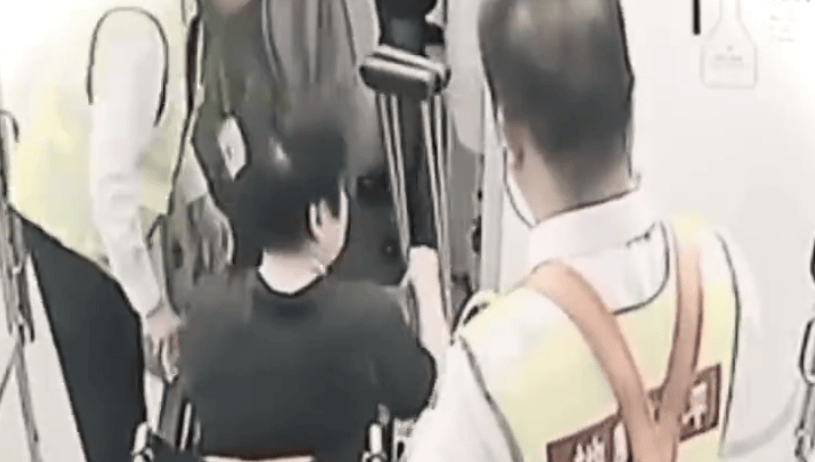 监控画面记录了郑智化登机完整过程,地勤人员将坐在轮椅上的郑智化推至机门,随后和空姐一同搀扶郑智化站立进入机舱。