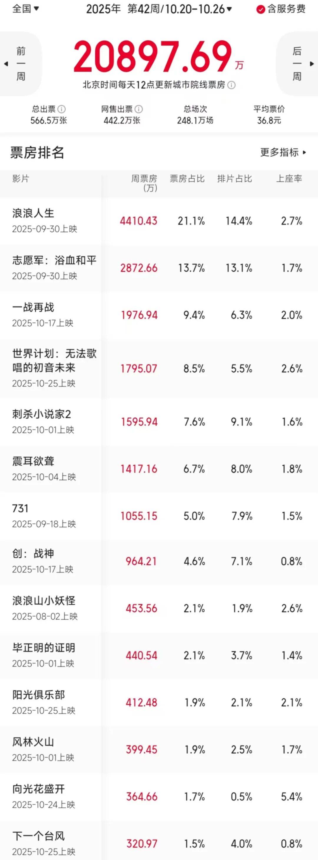 《浪浪人生》上周报收4410万蝉联周冠,目前累计票房已突破3.6亿,最终票房有望冲击4.5亿。