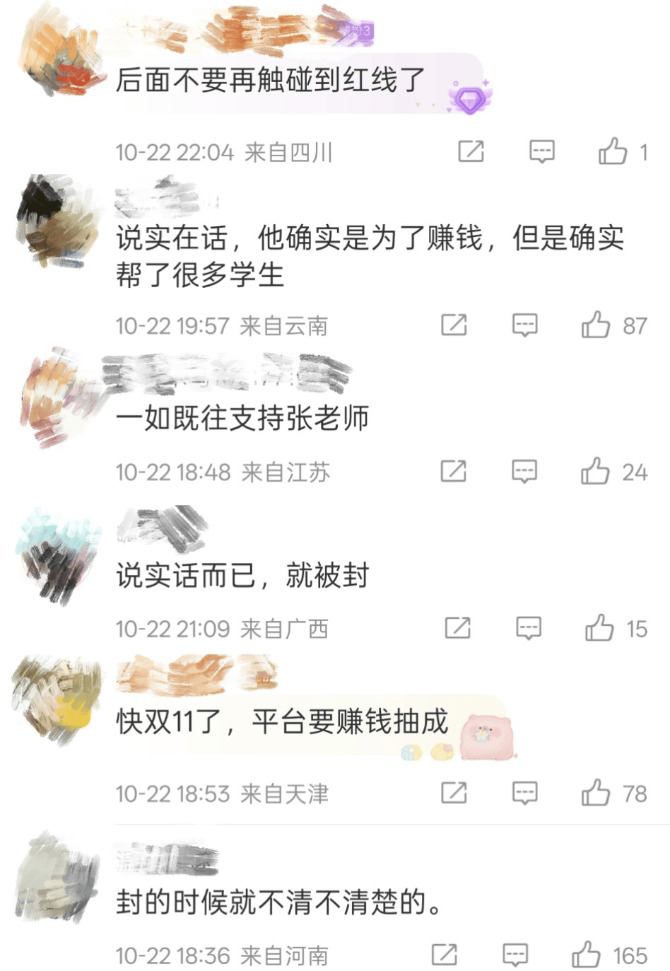 对此,网友议论纷纷。有的网友建议他安分守己,“不要再触碰到红线了。”有的网友称,经过这次封禁后,“张雪峰应该会更低调点吧。”也有网友支持他,“说实在话,他确实是为了赚钱,但是确实帮了很多学生。”“一如既往支持张老师。”“说实话而已,就被封。”更有网友认为,张雪峰此次回归,是因为双十一快到了,“快双11了,平台要赚钱抽成。”