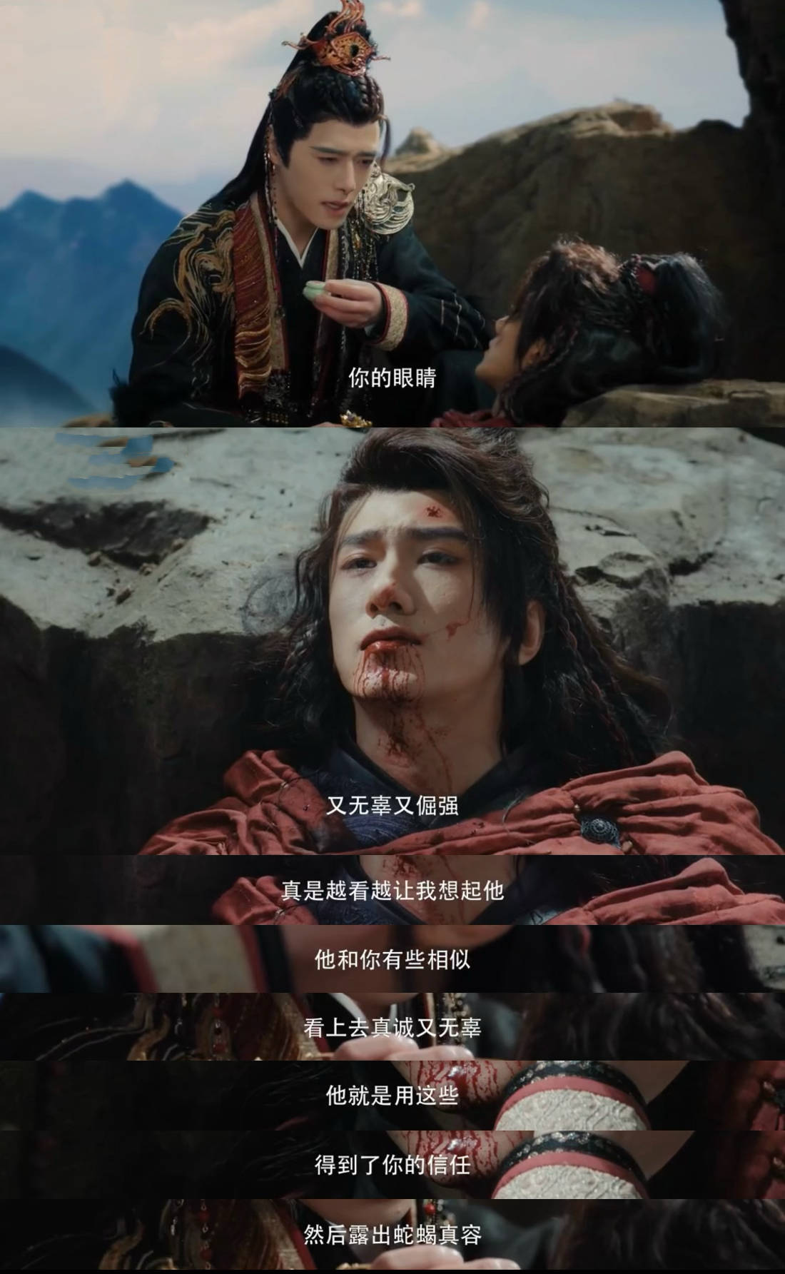 比如花式拍男主吐血——先俯拍血滴在水面上,再接男主嘴角流血的战损特写;比如在暗示男主身体有伤时,两次给到男主手摸肚子的大特写,据原著,男主肚子里装的是死去白月光师兄的心脏。