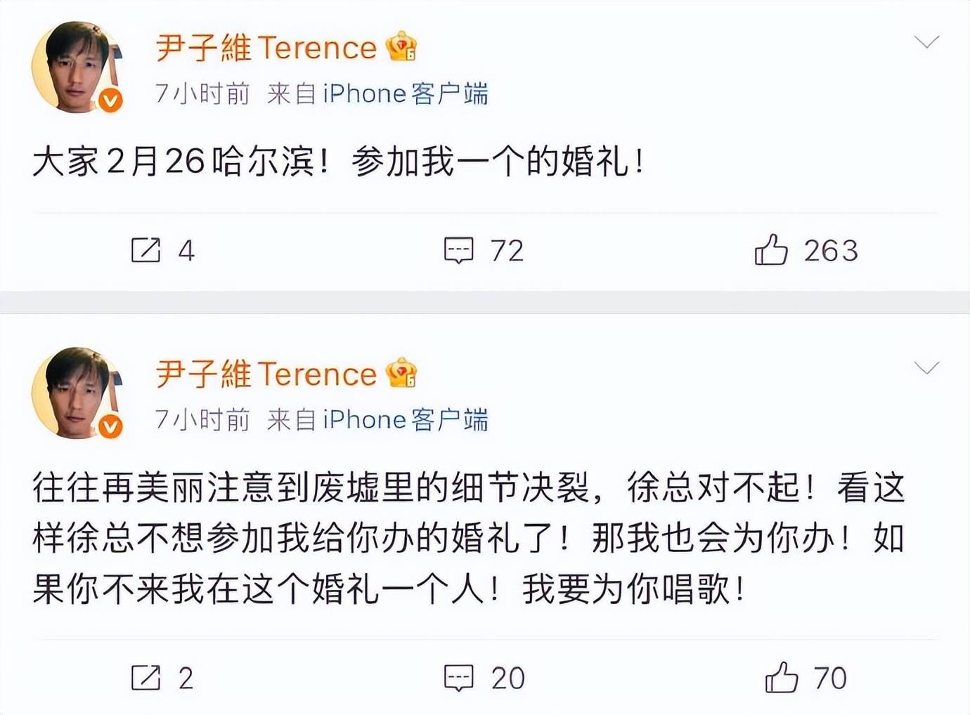 10月28日凌晨,尹子维突然在微博发长文道歉:“往往再美丽注意到废墟里的细节决裂,徐总对不起!”紧接着画风一转,单方面宣布:“徐总不想参加我给你办的婚礼了!那我也会为你办!如果你不来,我就在这个婚礼一个人!”文末甚至深情附注“我要为你唱歌”,并公开邀请网友参加这场“独角戏婚礼”。