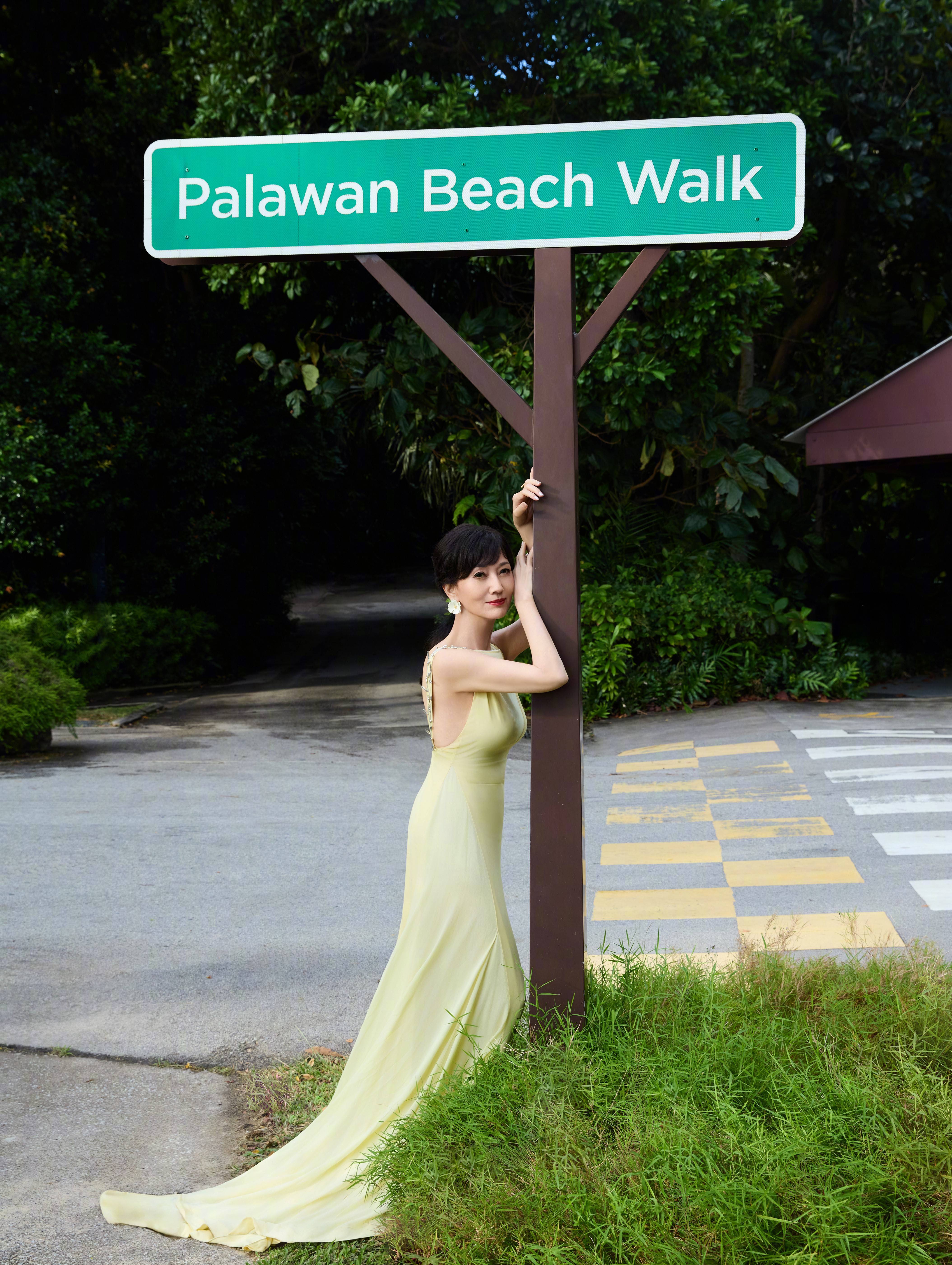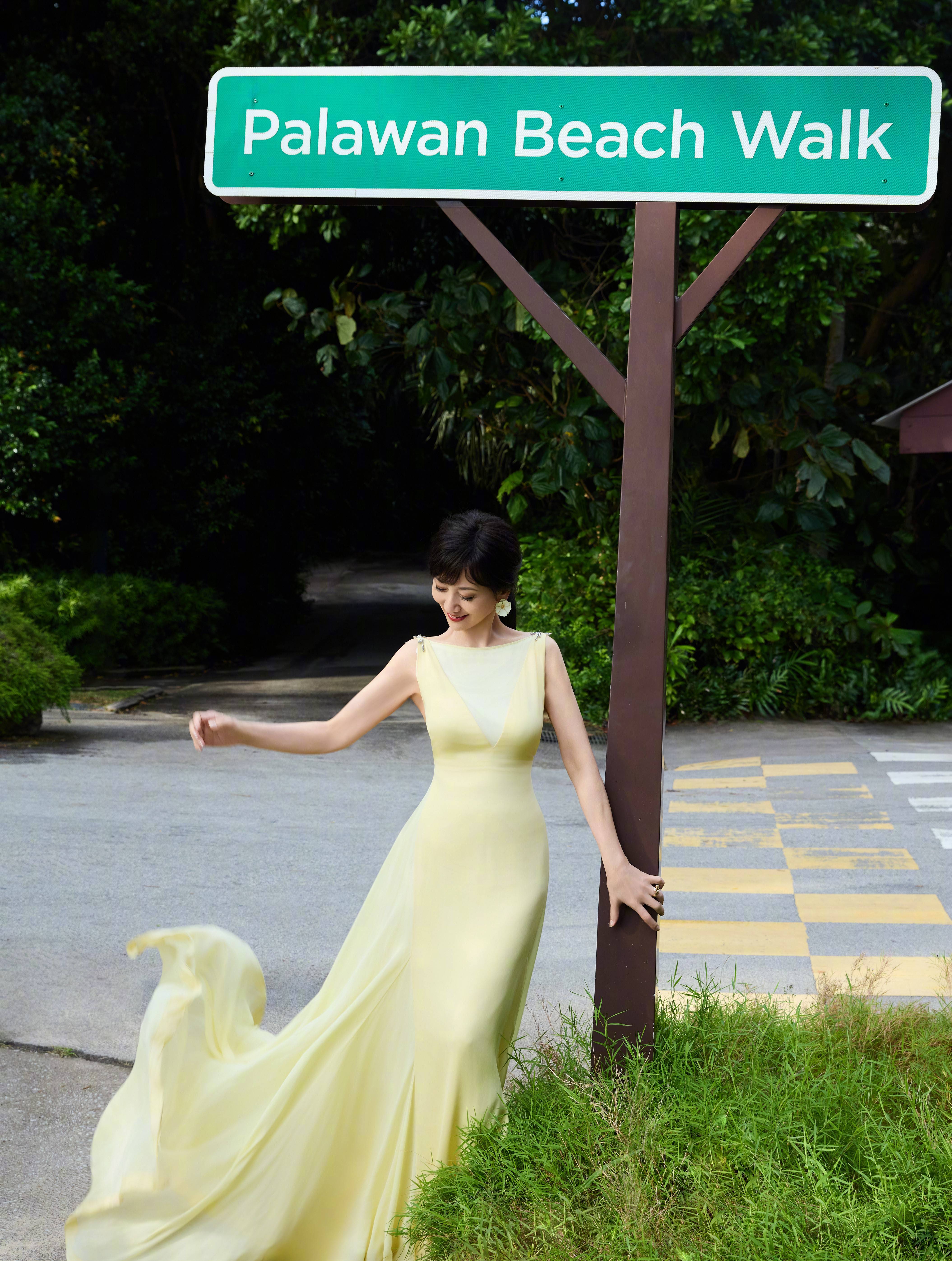 赵雅芝穿黄色吊带裙,身姿窈窕。