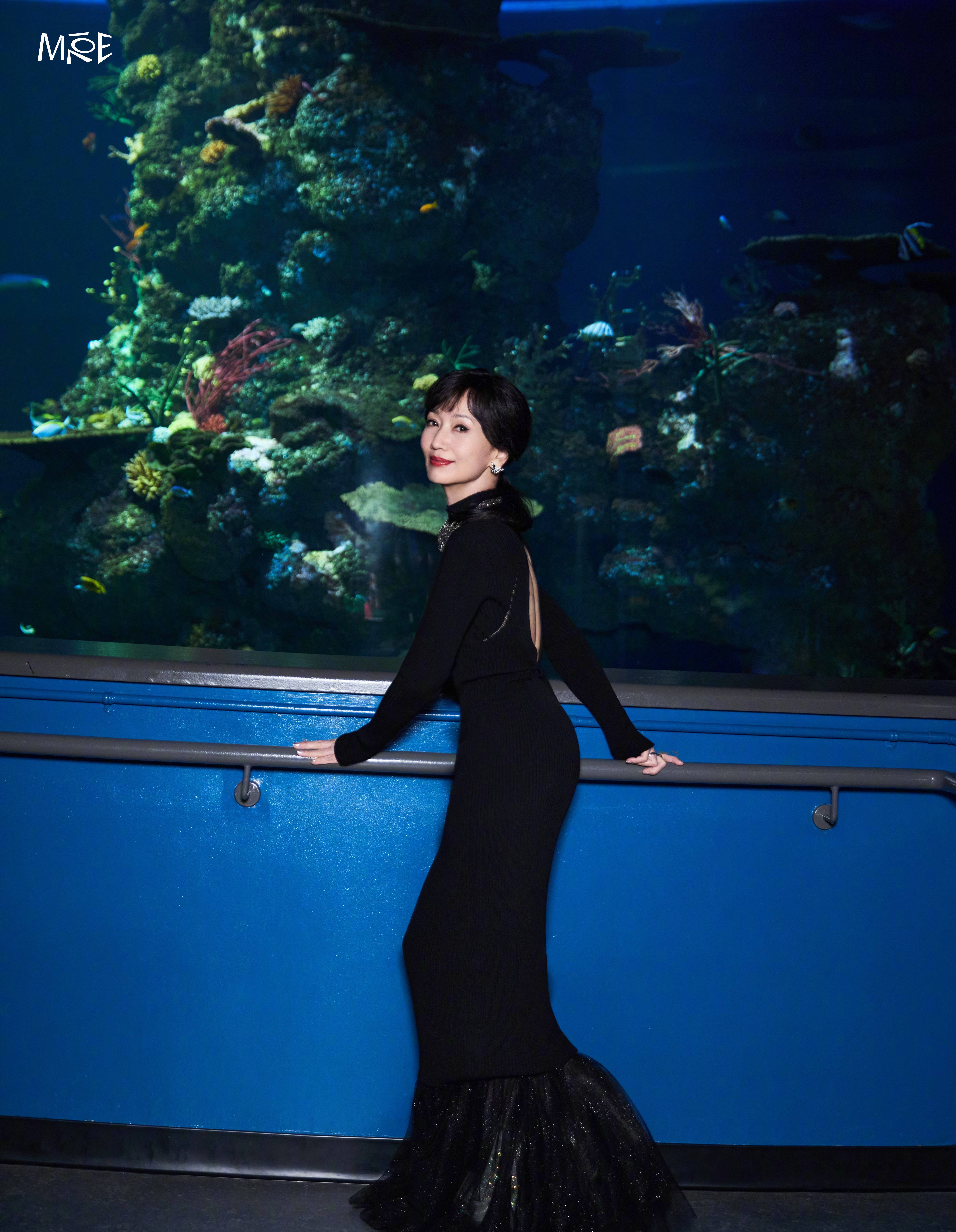 赵雅芝穿黑色紧身裙,皮肤白皙。
