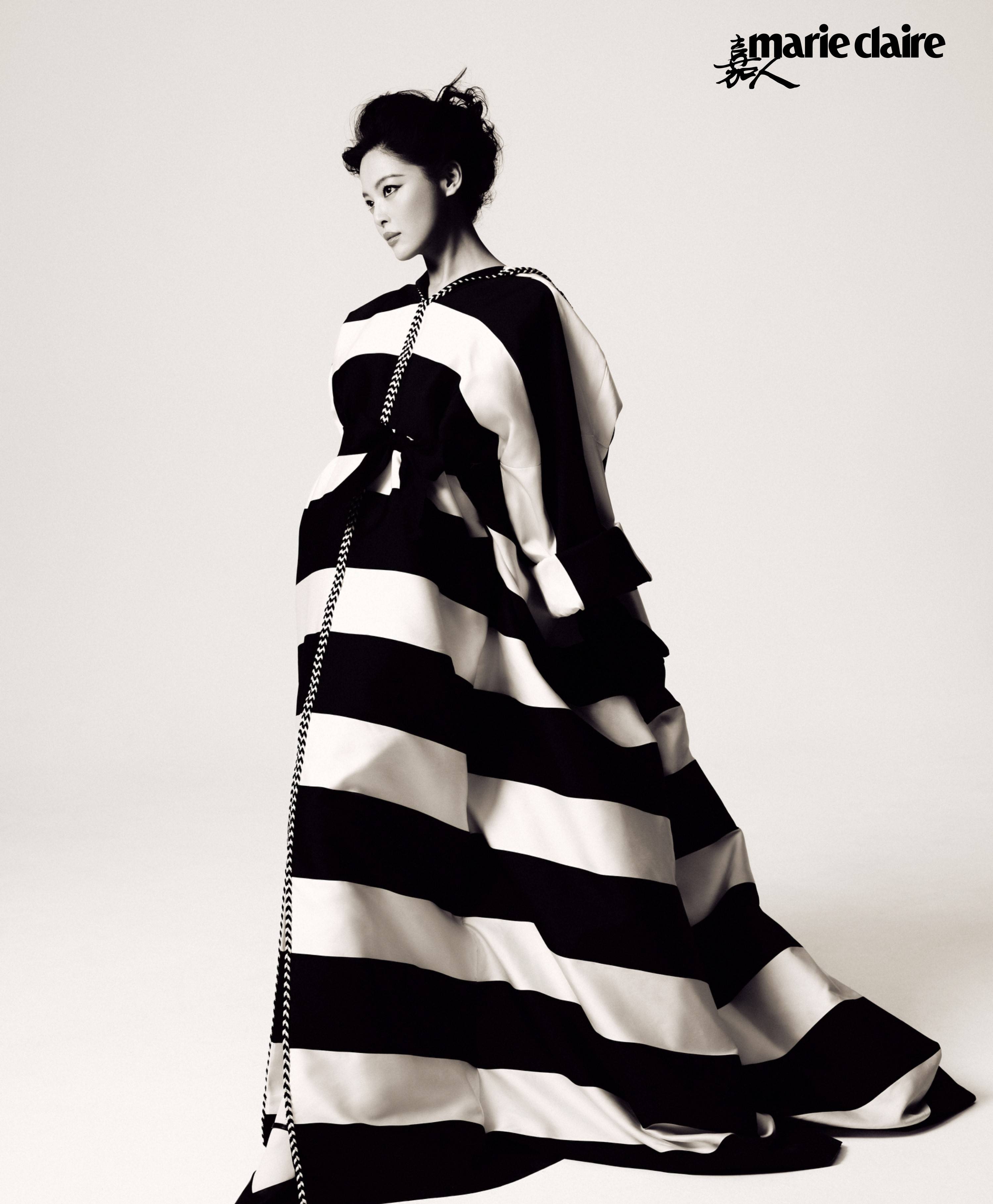 辛芷蕾身着黑白条纹长裙,气质冷艳独特。