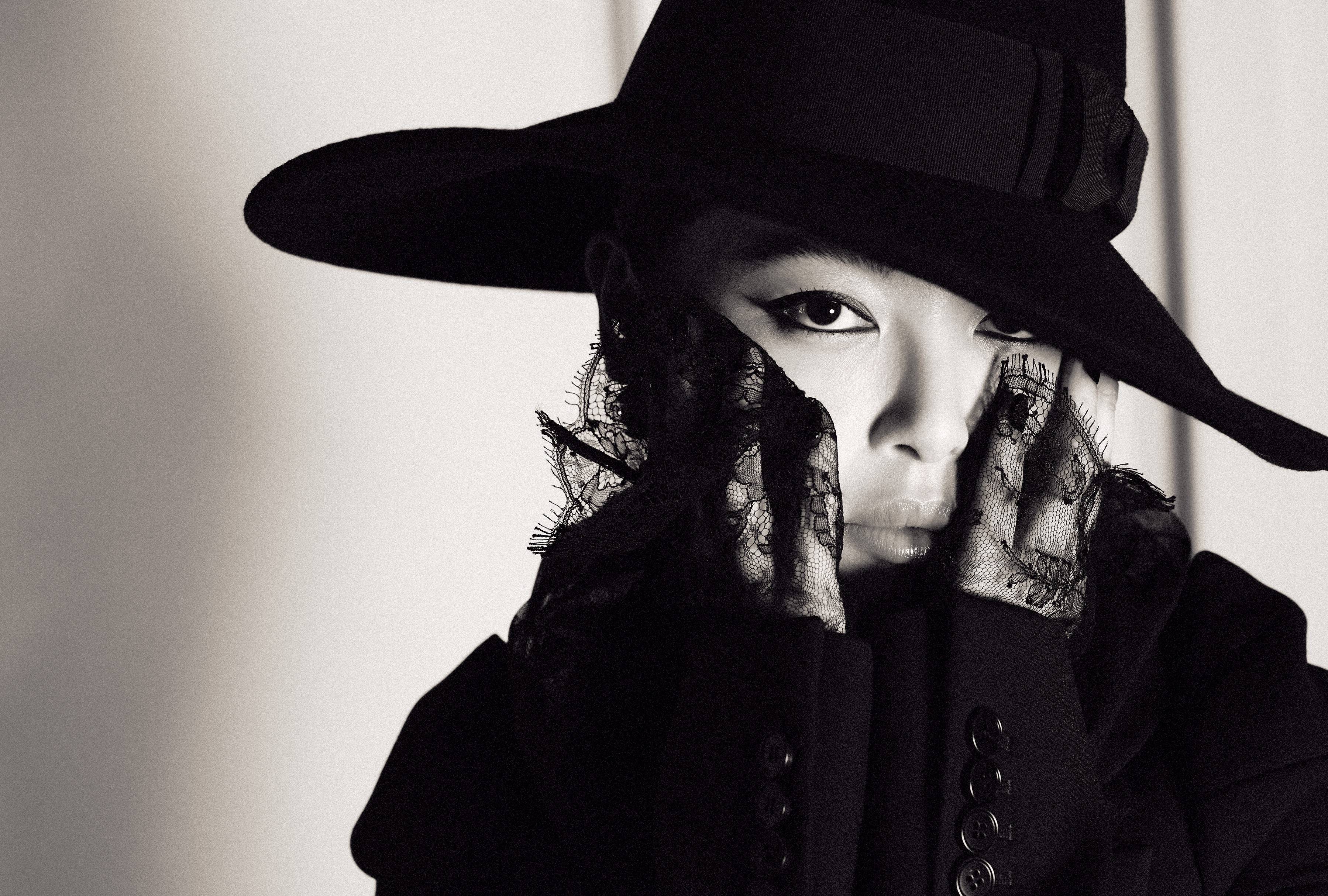 辛芷蕾戴宽檐帽,搭配蕾丝手套,极具神秘感。