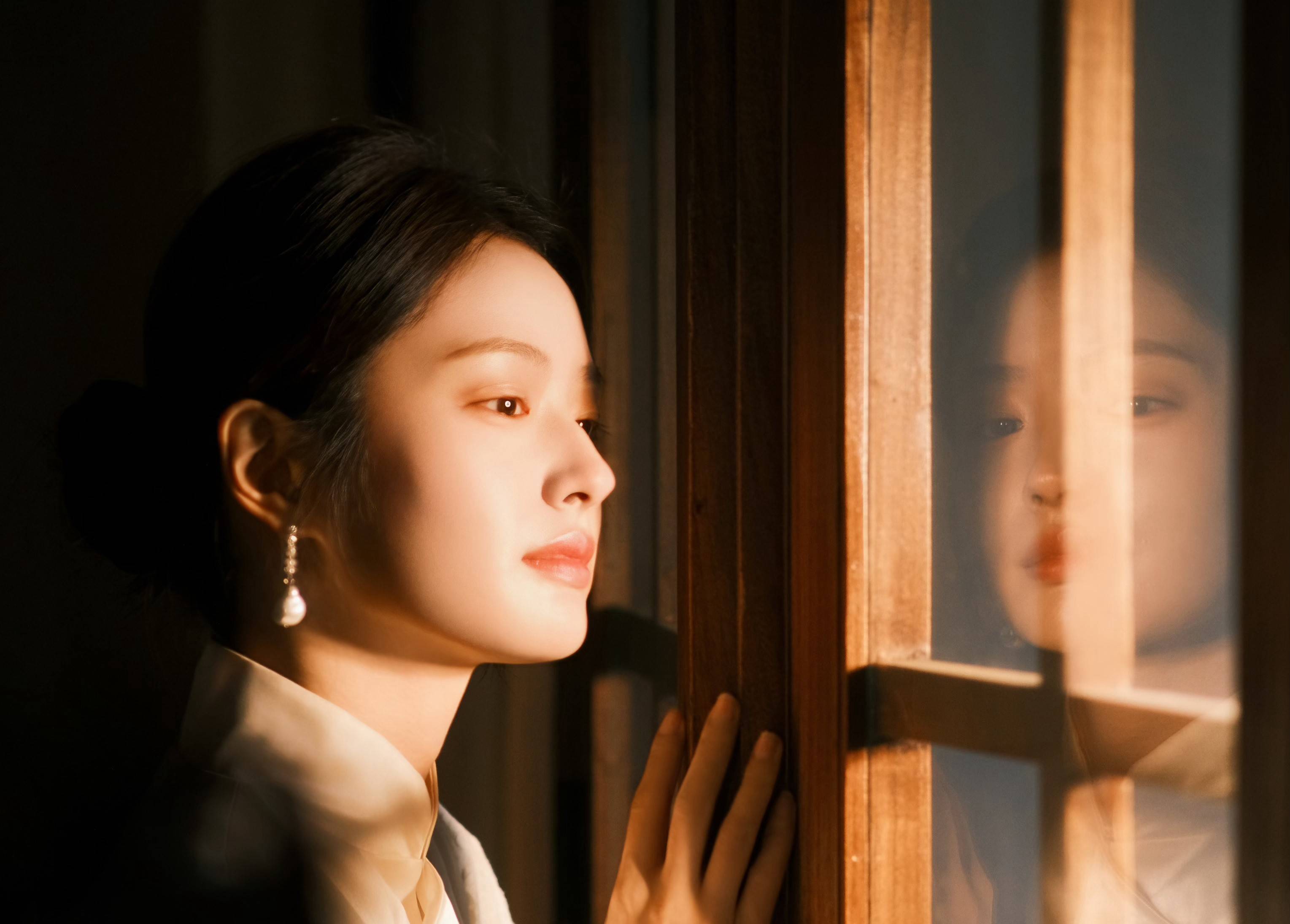 徐若晗优雅地坐在竹椅上,姿态闲适,气质温婉。