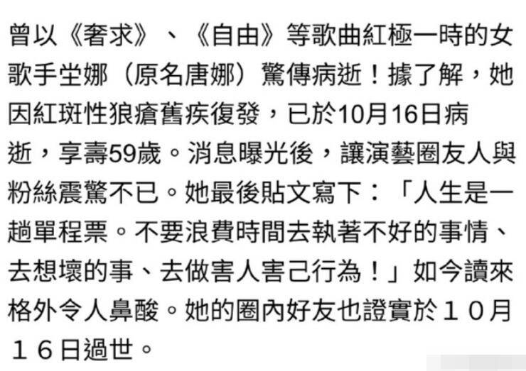 搜狐娱乐讯 据台媒报道,中国台湾女歌手坣娜疑似因红斑狼疮于16日病逝,享年59岁,该消息已被好友证实。