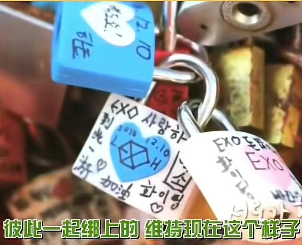 据团综片段显示,挂锁时几人还郑重许下约定。张艺兴轻抚锁面说“要一直在一起”,黄子韬则晃着钥匙喊“谁先离开谁是小狗”,鹿晗笑着把钥匙收进钱包:“这是我们的青春凭证”。这把锁的背面刻着“一生一起走”的韩文,后来被粉丝拍到在南山塔高处随风摇曳,成为粉丝打卡圣地。
