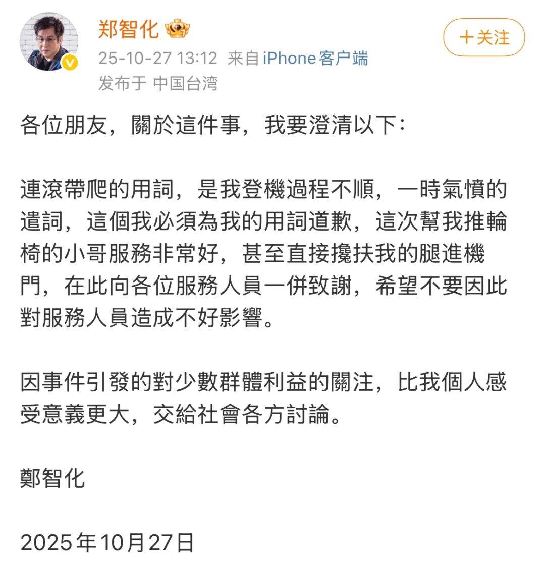 10月25日下午,歌手郑智化在微博发文,称深圳机场对残疾人的态度没人性,升降车离机门地板25公分,他的轮椅推不进飞机,腿也跨不进机舱门,操纵升降车的司机完全不愿把升降板提高,冷眼看着他连滚带爬进飞机。