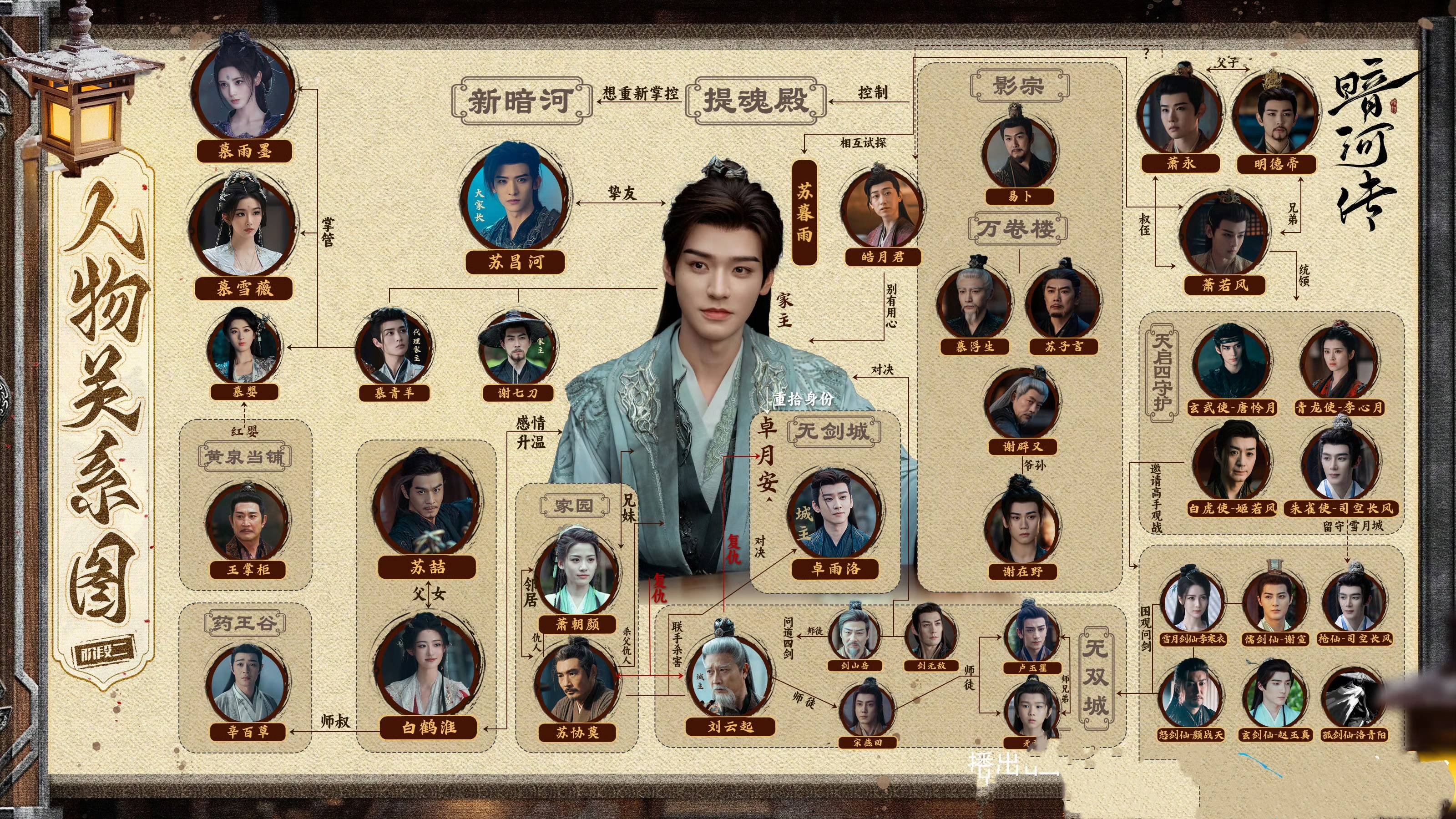 【新暗河】大家长/苏昌河(常华森 饰),苏家/家主苏暮雨(/龚俊 饰),前任/魁/苏喆(乔振宇 饰)。