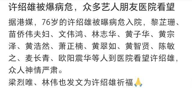 更令人震惊的是,苗侨伟夫妇、黎芷珊、文伟鸿、黄宗泽、萧正楠、黄子华、黄智贤、欧阳震华等多人赶往医院去探望,个个表情肃穆。