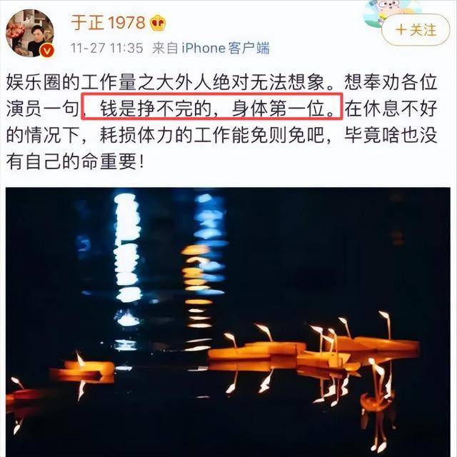 不禁想起于正的那句话,“钱是挣不完的,身体是第一位”。
