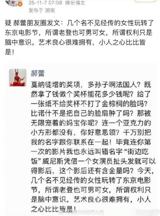 大概意思就是说《狂野时代》拿戛纳电影节临时增加的奖项,只有奖状没有奖杯,《狂野时代》导演毕赣是妈宝、辛芷蕾是靠赵涛才撕到威尼斯影后、几个女性(文宴)玩转东京电影节…