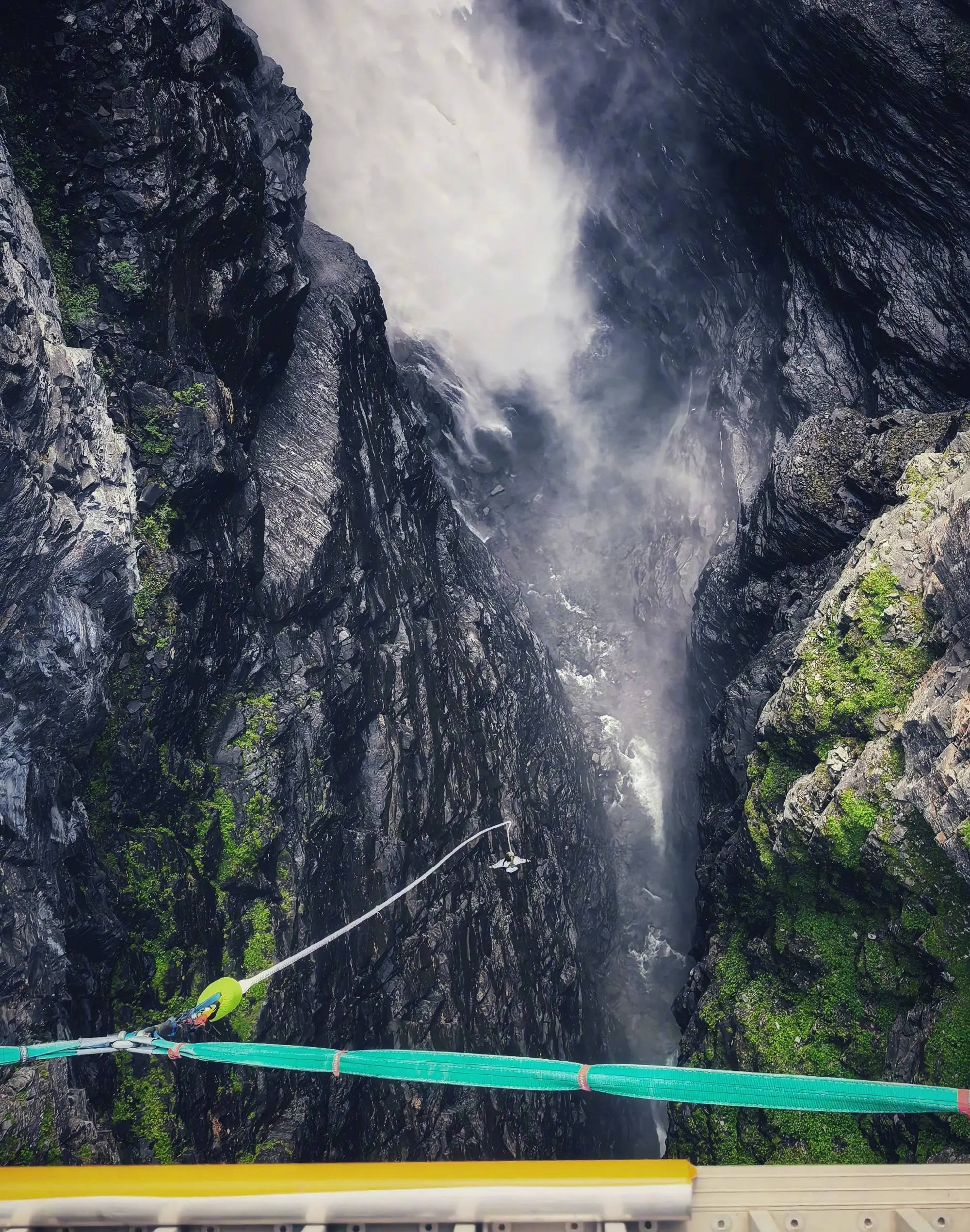 马思纯在峡谷瀑布旁挑战蹦极。