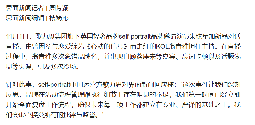 11月1日,歌力思集团旗下英国轻奢品牌self-portrait品牌邀请演员朱珠参加新品对话直播,由曾因参与恋爱综艺《心动的信号》而走红的KOL翁青雅担任主持。在直播过程中,翁青雅多次念错品牌名,并出现自顾落座未等嘉宾、忘词卡顿以及话题浅显等失误,引发多次冷场。