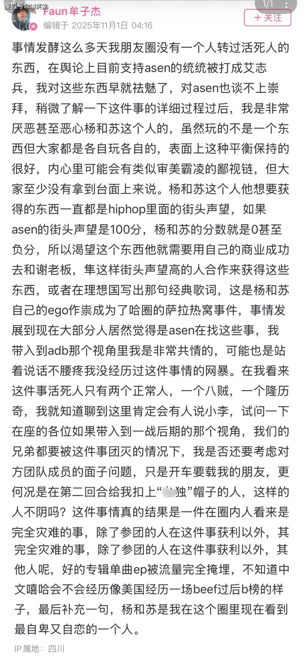 “如果asen的街头声望是100分,杨和苏的分数就是0甚至负分,所以渴望这个东西他就需要用自己的商业成功去和谢老板,隼这样街头声望高的人合作来获得这些东西,这是杨和苏自己的ego作崇成为了哈圈的萨拉热窝事件,大部分人居然觉得是asen在找这些事”