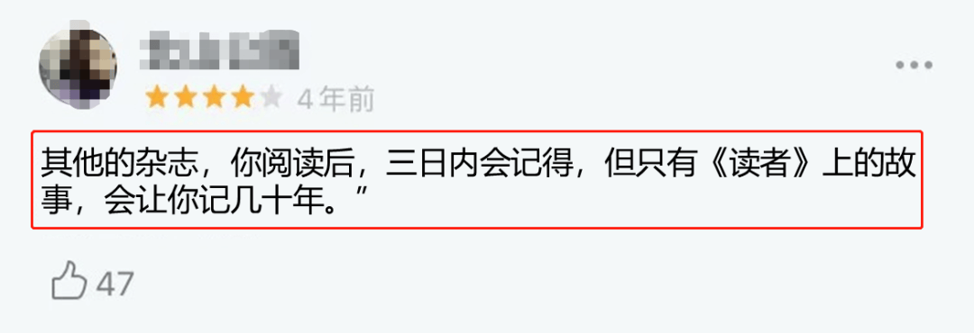 一位豆瓣读者更是直言,“其他的杂志,你阅读,三日内会记得,但只有《读者》上的故事,会让你记几十年。”