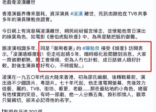 另外,据陈勉良透露,凌汉生前为人非常和善,对后辈演员也很照顾,时不时都会提点他们。
