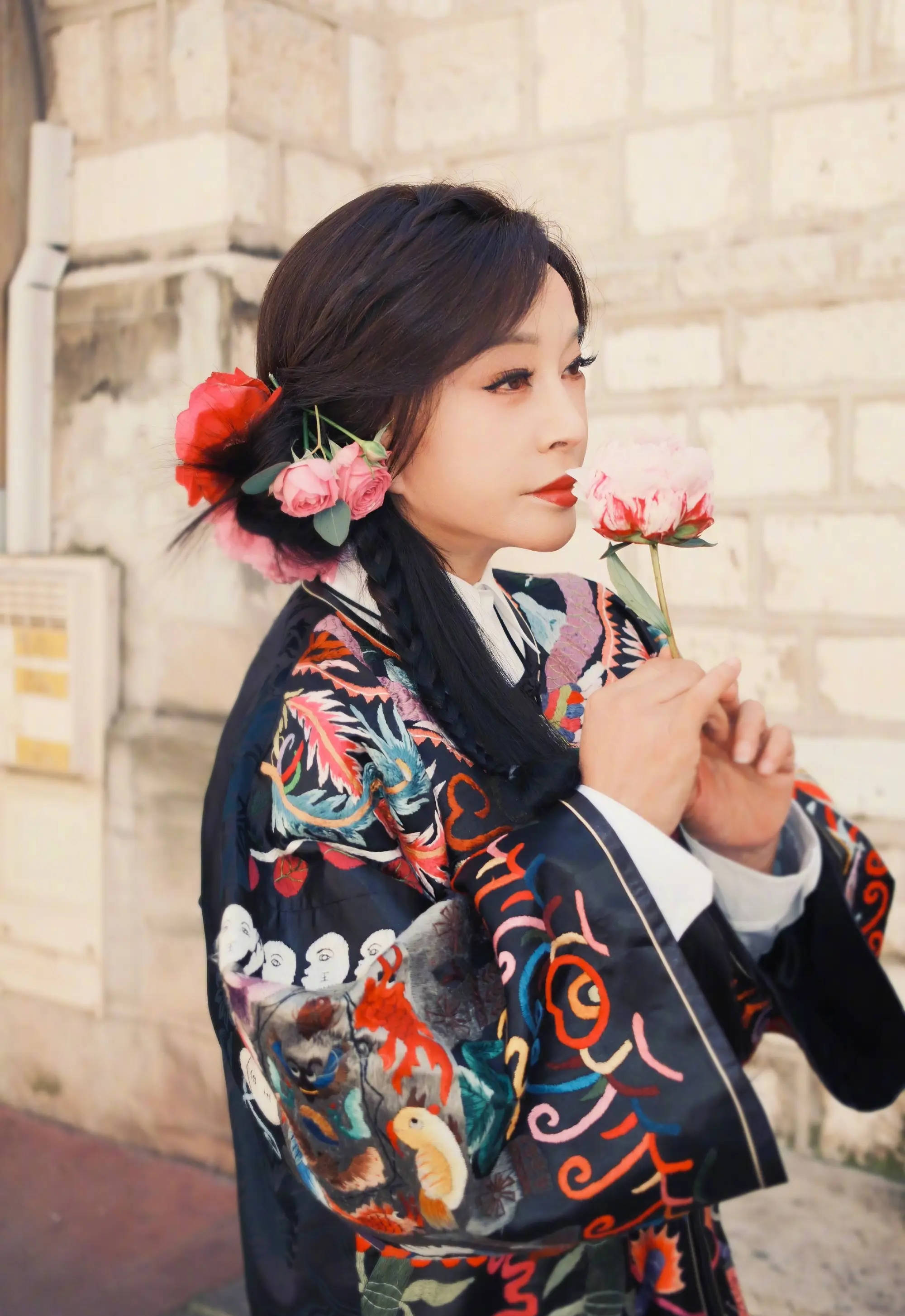 刘晓庆头上戴花,依旧保持少女心。