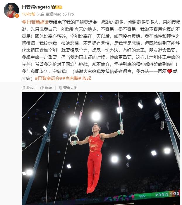 搜狐娱乐讯 8月1日,中国体操运动员肖若腾在个人社交账号发文告别巴黎奥运会:“团体比赛心稀碎,全能比赛在一天以后,如同没有灵魂,不是拥有悲情,是我就是悲情。”