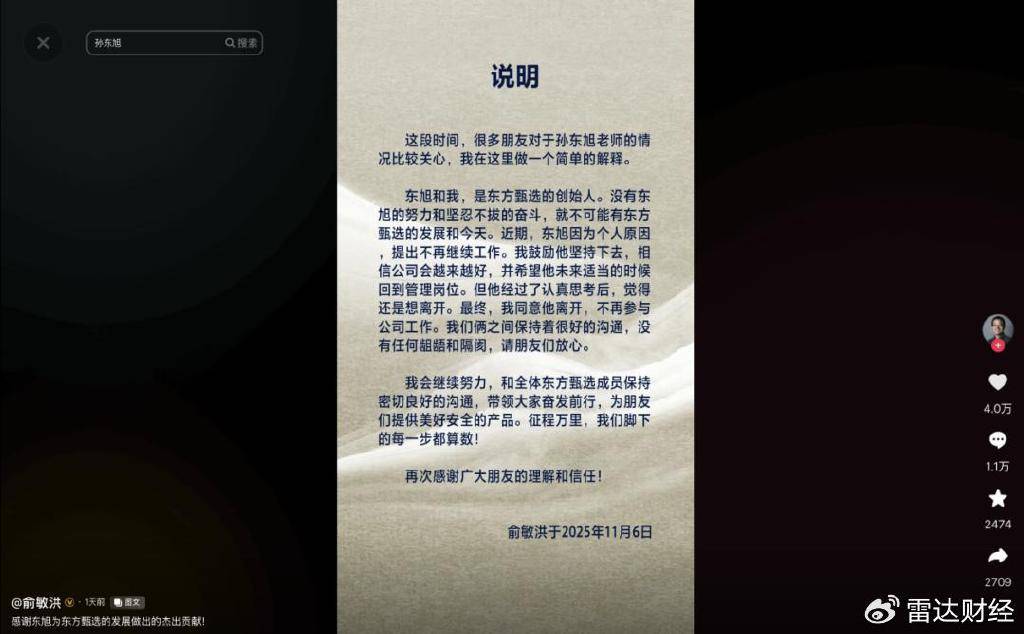 “近期,东旭因为个人原因,提出不再继续工作”,11月6日,身为新东方及东方甄选创始人的俞敏洪,在其个人账号上公布了前东方甄选CEO孙东旭离职的消息。