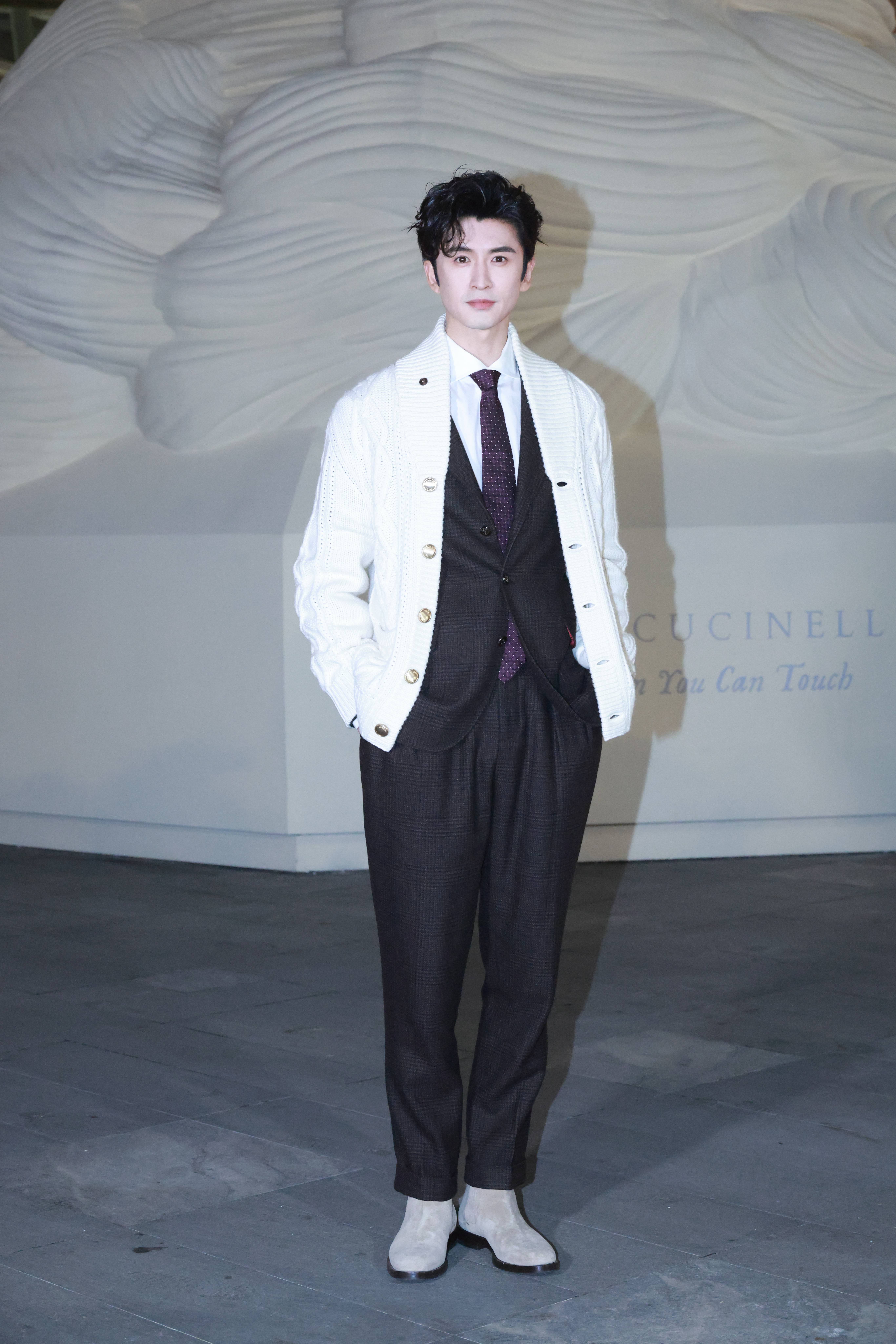 张云龙身穿白色羊毛外套搭配格纹西装,优雅绅士。