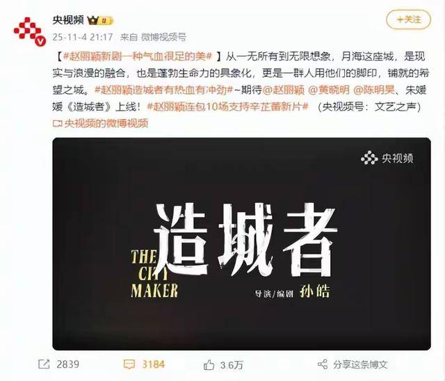 在今年11月4日时,央视底下的一个账号就特意提到了赵丽颖之前拍摄的《造城者》。
