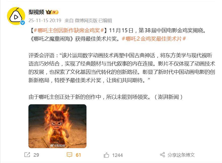 11月15日的颁奖典礼上,《哪吒2》成功摘得“最佳美术片”桂冠。然而,从导演饺子(杨宇)到制作团队,再到出品方光线影业,竟无一人现身。主持人苏有朋只能现场打圆场,解释称“团队正全力投入后续创作”,奖杯后续寄送。直至次日,影片的官方社交账号也对此重大获奖只字未提,与其他获奖方的热烈庆祝形成了鲜明对比。