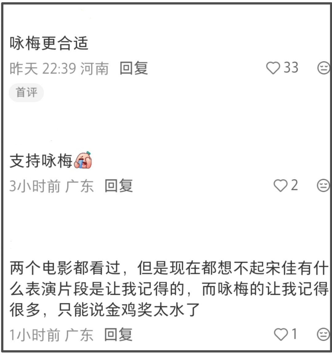 怀揣着愤愤不平的心情,激动的网友冲向各大官方账号的评论区。首当其冲的自然就是电影频道官方账号,在官方恭喜宋佳二封金鸡奖最佳女主角这条动态的评论区中,第一条评论就是质疑金鸡奖太水了,明明同台竞技的女演员有更好的,但是奖偏偏给了略逊一筹的人。此外,前排的多数评论都是在为咏梅鸣不平,直言宋佳的表演比不上咏梅。