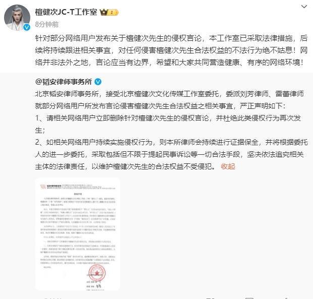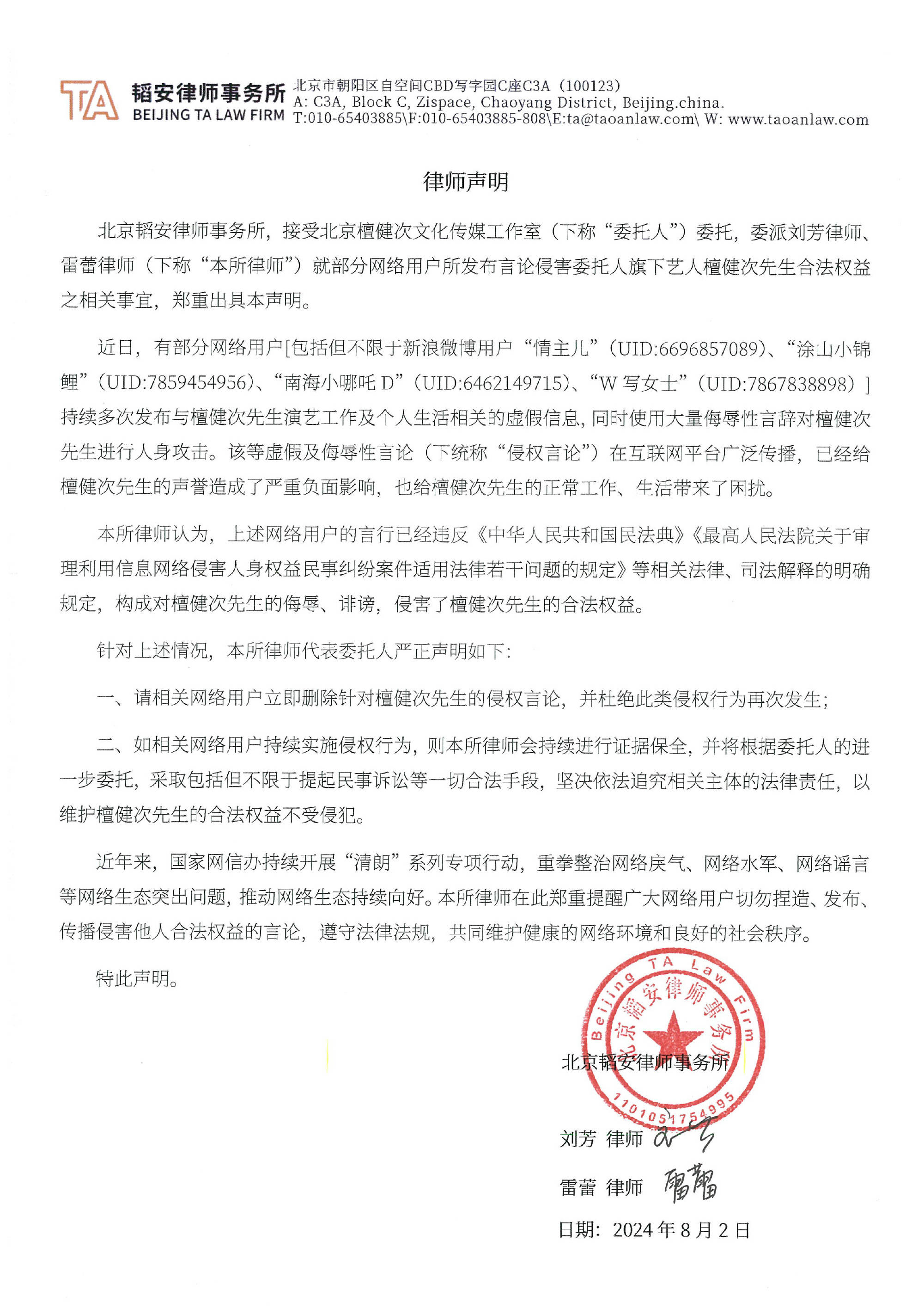搜狐娱乐讯 2日,檀健次工作室转发律师声明,并发文称针对部分网络用户发布关于檀健次的侵权言论,已采取法律措施,后续将持续跟进相关事宜,对任何侵害檀健次合法权益的不法行为绝不姑息。