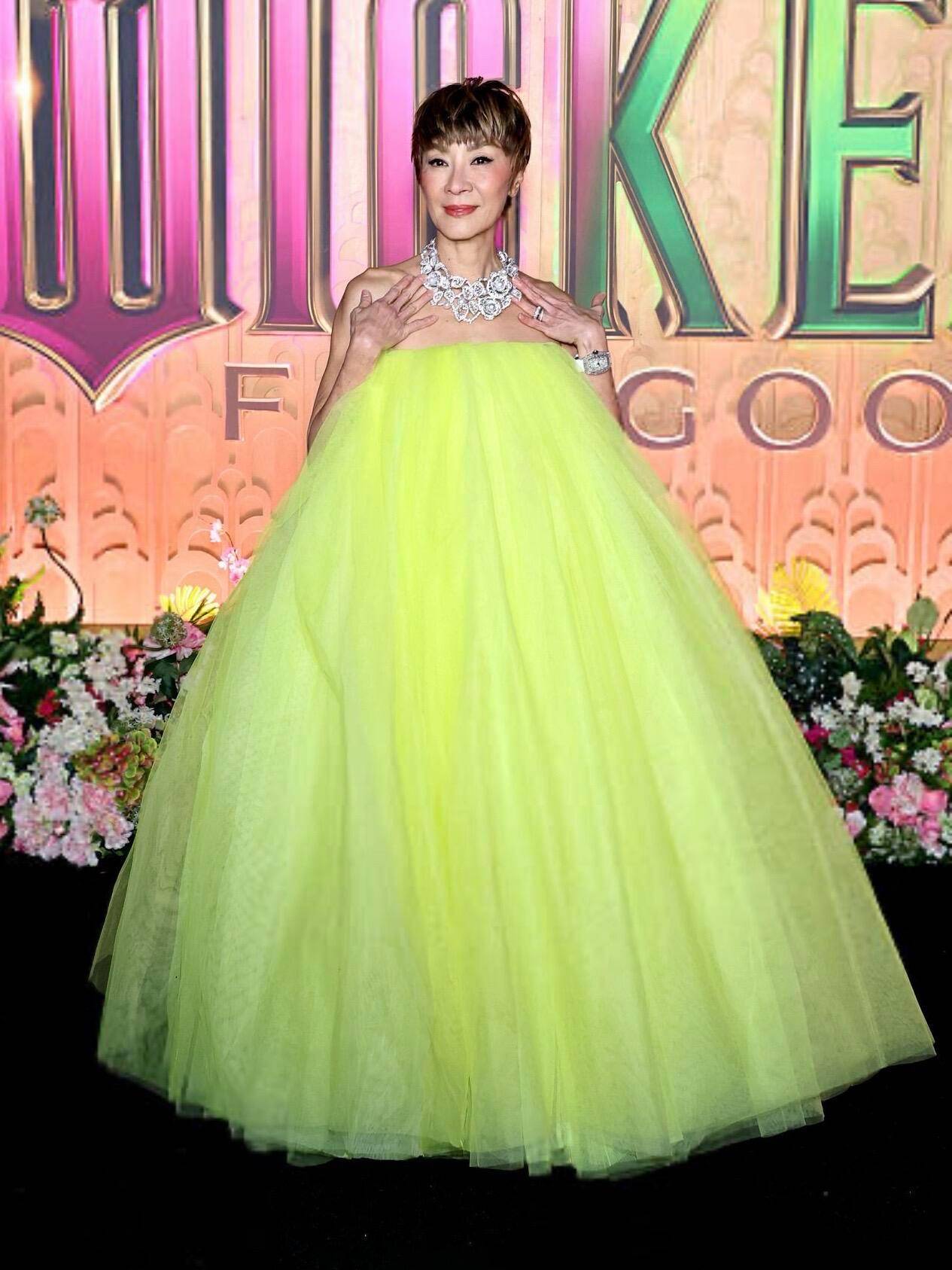 搜狐娱乐讯 《魔法坏女巫2》剧组亮相纽约首映礼,主演杨紫琼一袭鹅黄色抹胸蓬蓬裙配短发俏丽吸睛。