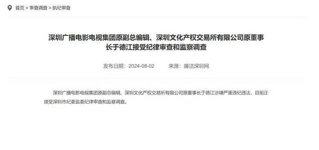 主编温静导读:深圳广播电影电视集团原副总编辑、深圳文化产权交易所有限公司原董事长于德江涉嫌严重违纪违法,目前正接受深圳市纪委监委纪律审查和监察调查。