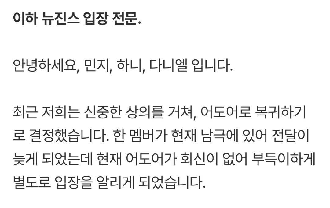 11月12日,在ADOR率先宣布Haerin和Hyein将重返厂牌后,不到三个小时内,其余三名成员Minji、Danielle和Hanni则通过单方面声明表示同样打算回归,并特别强调,由于一名成员(后经证实是Hanni)身在南极、沟通受限,只能独立于公司发声,以免造成信息滞后。