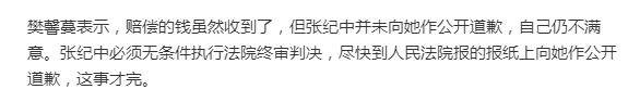 张纪中拒绝道歉并坚称是员工的错,同样,樊馨蔓也坦言无法接受,虽然她已经收到了张纪中的赔款,可自己的隐私权遭到侵犯,内心也受到重创。樊馨蔓最后还不忘喊话张纪中,要他必须无条件执行法院终审判决,尽快到官方报刊上发布声明向她道歉。