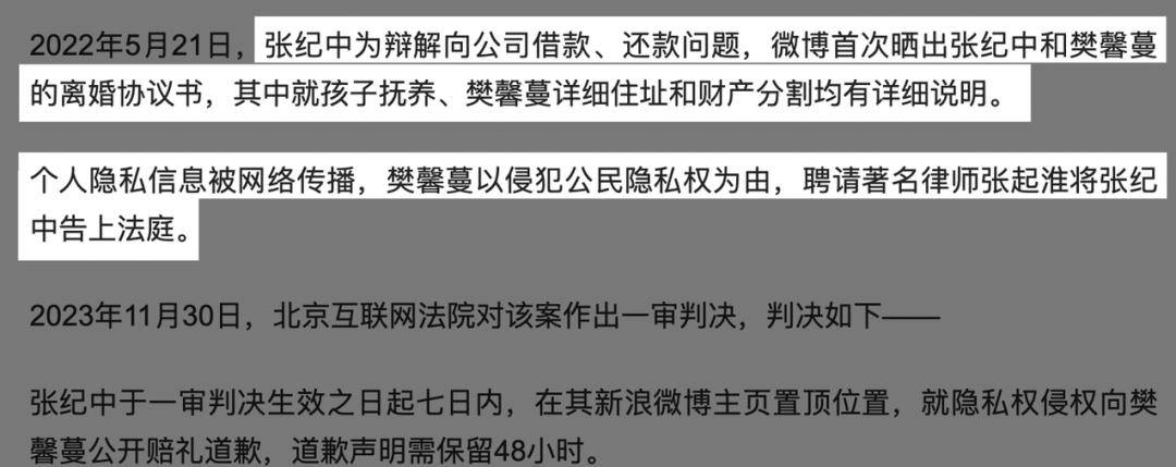 这些都让樊馨蔓最终决定要和张纪中对簿公堂,迄今为止,樊馨蔓和张纪中打了至少有三次官司,而有关此次张纪中被强执2.5万,还要追溯到2023年底,当时的樊馨蔓将张纪中告上法庭,并要求男方公开道歉。