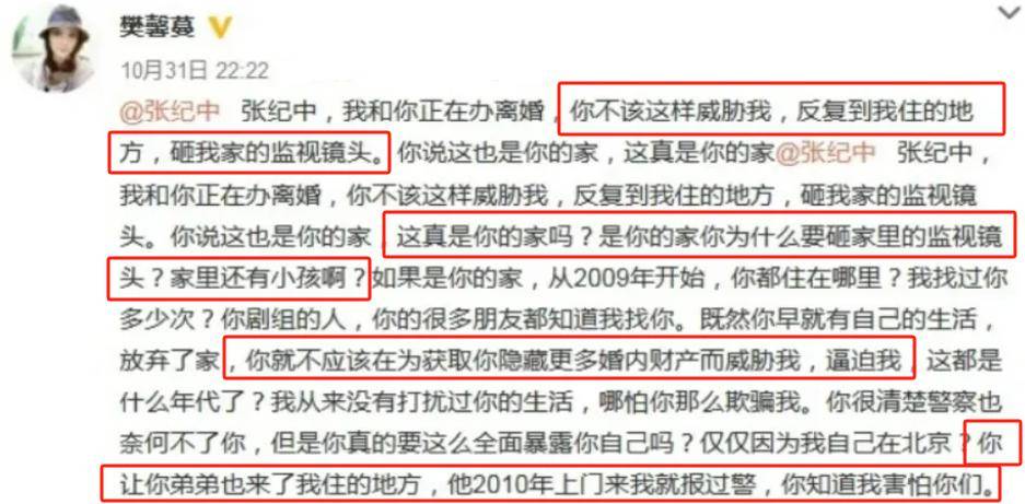 显然,张纪中和樊馨蔓几乎已经撕破脸,而让她再也无法沉默的原因是和对方的离婚协议书在全网曝光,其中包括樊馨蔓本人的身份证号和家庭住址,以及孩子的有关信息,更甚者,还有当时她和张纪中离婚割分财产的详细信息全都通通被迫公开了。
