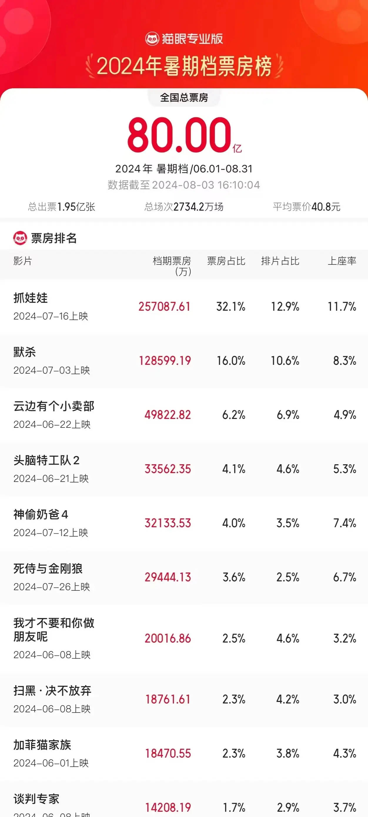 搜狐娱乐讯 据猫眼专业版数据,截至8月3日16时10分,2024年暑期档档期(6月1日-8月31日)总票房(含预售)突破80亿,《抓娃娃》《默杀》《云边有个小卖部》依旧稳坐档期票房榜前三位。