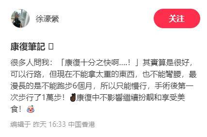 相比陈奕迅,徐濠萦一刻也闲不住,术后一个月恢复运动,步行一万步。