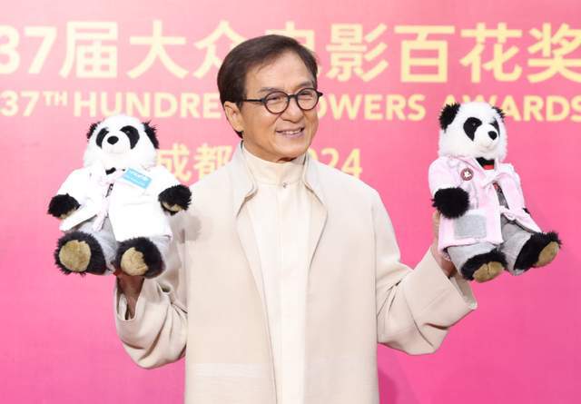 成龙也来到了现场,如今70岁的成龙依旧活跃在影坛,这次露面也是精神抖擞,手拿两个熊猫,笑容满面,发量也很健康。