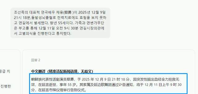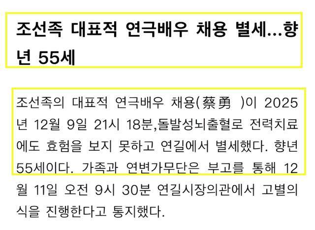 由于相关的讣告是朝鲜语,所以不同网站翻译的内容有所区别,但结合多数的结果来分析,蔡勇去世应该是突发性脑溢血导致。