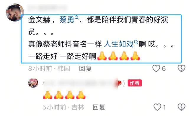 可能很多外省的网友不知道,蔡勇在当地的知名度非常高,以至于很多粉丝在悼念的时候,特地说了这样一段感人肺腑的话语:金文赫、蔡勇,都是陪伴我们青春的好演员,真像蔡老师名一样,人生如戏啊,一路走好、前两天直播还看见他了,这么突然……