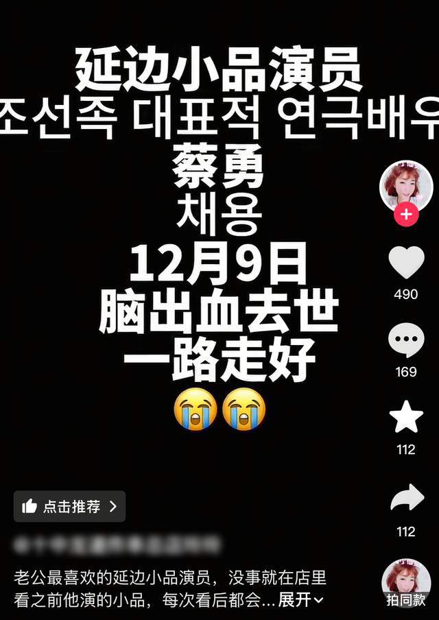 公共开的讣告中透露,蔡勇是在9号晚9点18分离开的,脑出血之后虽然经全力抢救,仍未能挽回其生命,追悼会则定在11号上午9点半,地点位于延边市殡仪馆。