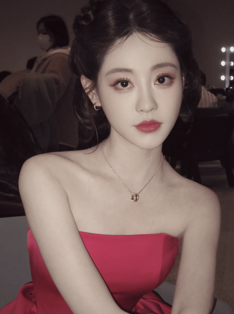 祝绪丹玫红抹胸礼服衬出纤柔手臂,姿态灵动又明艳。
