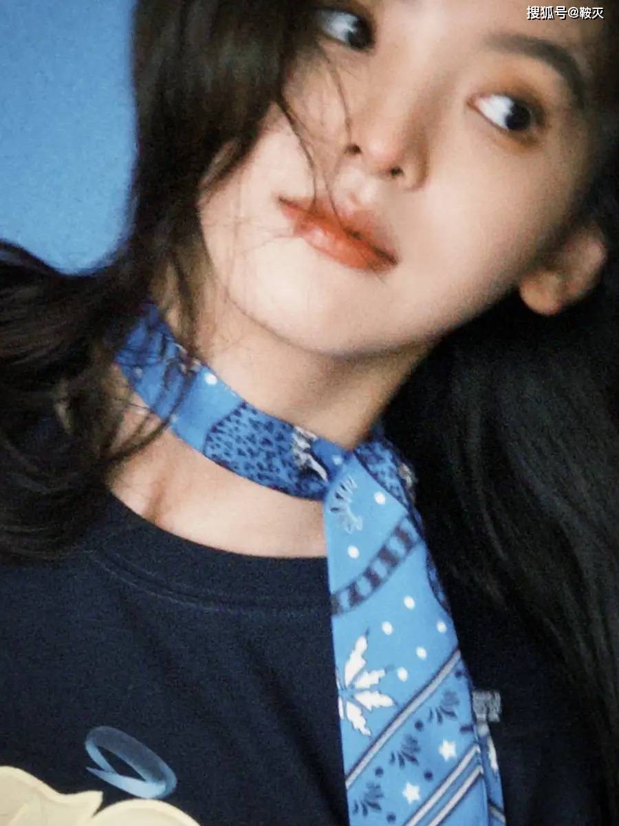 章若楠戴蓝色领带,笑容明艳