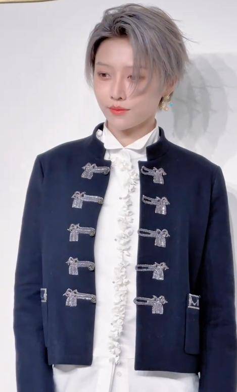 浅灰色短发利落又个性,再加上丝绒材质自带光泽感,更增添了几分贵族气质。